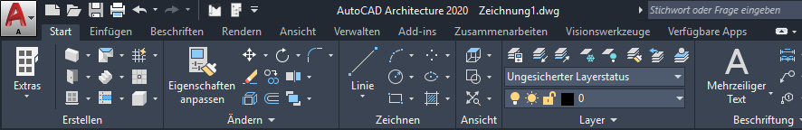 AutoCAD Architecture 2027-Toolsetverfügt über einen einzigen Vorgabe-Arbeitsbereich (Architektur). Die Menüs und Befehle der früheren Arbeitsbereiche (Gestaltung, Ausarbeiten, Detaillieren und Visualisieren) können über die Registerkarten der Multifunktionsleiste aufgerufen werden.