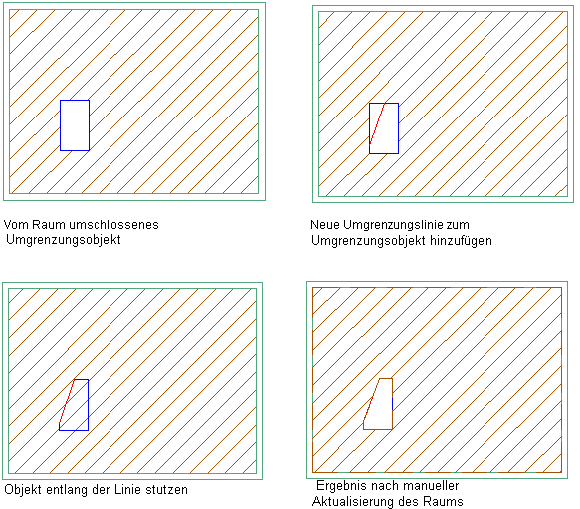 Wenn Sie ein Umgrenzungsobjekt stutzen, indem Sie ein Umgrenzungsobjekt an der Stutzposition ersetzen, wird das neue Objekt nicht automatisch als Umgrenzungsobjekt für den Raum erkannt, da es zuvor nicht im Raum enthalten war. In diesem Fall müssen Sie den Raum manuell aktualisieren, damit das neue Umgrenzungsobjekt erkannt wird. Im Folgenden finden Sie ein Beispiel: