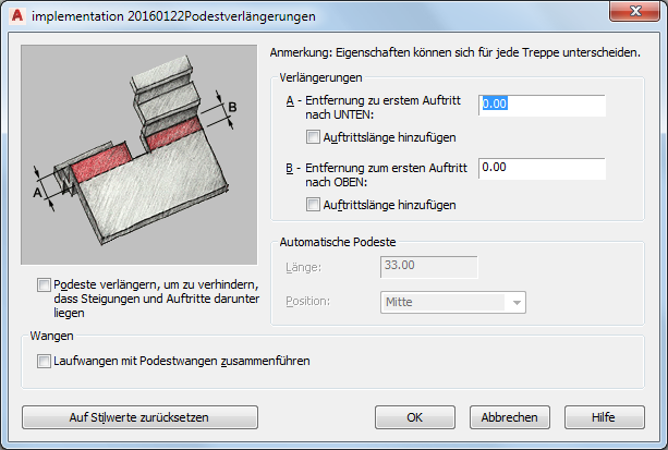 Für Treppen, die in früheren Versionen der Software erstellt wurden, ist die Einstellung Podeste verlängern, um zu verhindern, dass Steigungen und Auftritte darunter liegen automatisch aktiviert. Es empfiehlt sich, diese Einstellung für bündige oder rechteckige Podeste zu deaktivieren. Da die Position des oberen oder unteren Treppenendes auf diese Weise geändert wird, müssen andere Gebäudeobjekte unter Umständen angepasst werden.