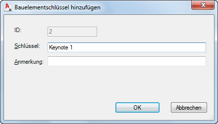 . Im Dialogfeld Bauelementschlüssel - Eigenschaften wird die Datenbankkennung des Bauelementschlüssels, den Sie gerade bearbeiten, in einem schreibgeschützten Feld angezeigt.