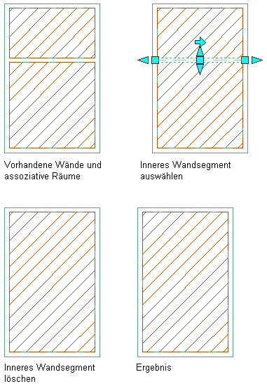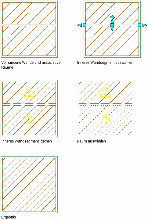 Assoziative Räume können verbunden werden, indem die zwischen ihnen befindlichen Umgrenzungsobjekte entfernt werden. Wenn Sie die automatische Aktualisierung assoziativer Räume aktiviert haben, läuft die Aktualisierung automatisch ab.