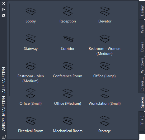 Vom CAD-Manager oder anderen Benutzern erstellte Werkzeugpaletten können ebenfalls Raumwerkzeuge mit Raumstilen und -eigenschaften enthalten, die für Ihre Projekte oder Anforderungen angepasst sind.