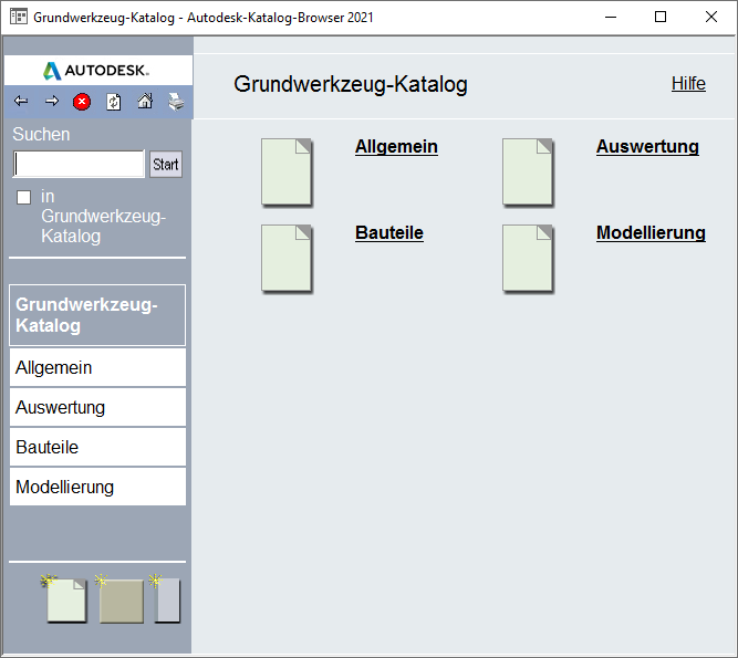 Wenn Sie den Grundwerkzeugkatalog öffnen, wird im rechten Fensterausschnitt eine Titelseite angezeigt, auf der der Katalog beschrieben wird. Wenn für einen Werkzeugkatalog keine Titelseite definiert ist, werden die im Werkzeugkatalog enthaltenen Elemente im rechten Fensterausschnitt angezeigt.