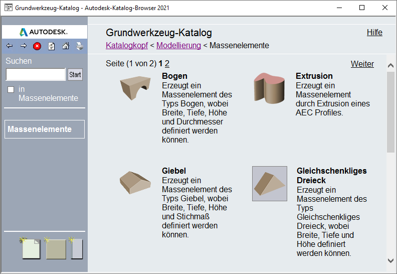 Kategorie Massenelemente im Grundwerkzeugkatalog