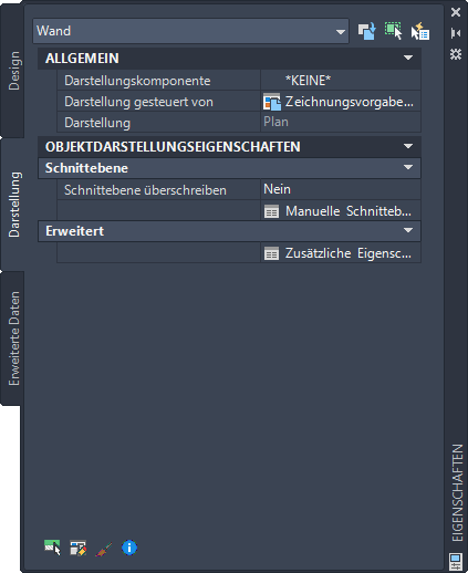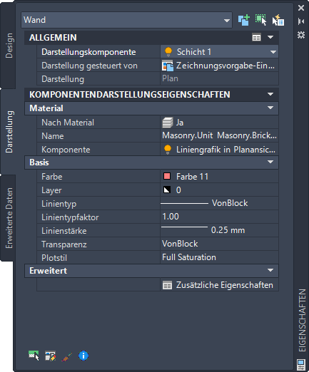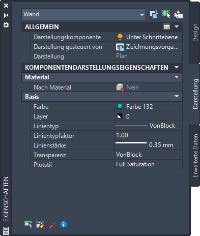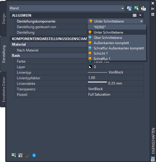 Sie können die Registerkarte Darstellung der Eigenschaftenpalette verwenden, um die Einstellungen der Darstellungseigenschaften für ein ausgewähltes Objekt in der aktuellen Darstellung zu ändern. Sie können Einstellungen für Eigenschaften ändern, die das gesamte Objekt betreffen (wie die Schnittebenenhöhe), sowie Einstellungen für die einzelnen Darstellungskomponenten des Objekts (wie Farbe, Layer und Linientyp für eine Schraffurkomponente).