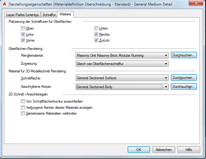 . Über sie wird ein Dialogfeld geöffnet, in dem Sie die mit der Materialdefinition verbundenen Darstellungseigenschaften anzeigen und ändern können (z. B. die Platzierung der Schraffuren für Oberflächen und das Material für 3D-Modellschnitt-Rendering in der Abbildung unten).