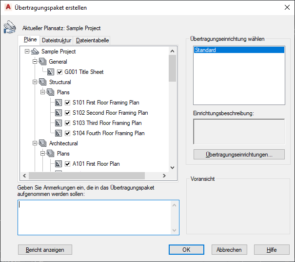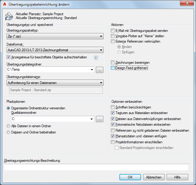 Einbeziehen von Plansatzdaten und -dateien (DST) in das Übertragungspaket Wählen Sie Plansatzdaten und -dateien einfügen.