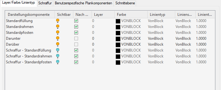 Gehen Sie wie folgt vor, um die Eigenschaften einer oder mehrerer Schnittebenen für einen Tür-Fenster-Kombinationsstil festzulegen. Darstellungseigenschaften von Schnittebenen werden nur in Plan-Darstellungen bei der Draufsicht auf eine Zeichnung angezeigt.