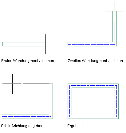 Diese Option schließt den Raum durch Zeichnen zweier Wände in der angegebenen Richtung. Die Verlängerung erfolgt in diese Richtung, bis sie auf eine Linie trifft, die senkrecht zur Anfangskante einer der Wände steht. Um diese Option beim Platzieren von Wänden zu verwenden, geben Sie in der Befehlszeile or (Ortho) ein.