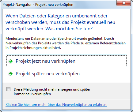 Das Dialogfeld Projekt-Navigator - Projekt neu verknüpfen wird angezeigt.