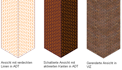 Durch die Verwendung von Materialien können Sie Objekte realistischer darstellen. Die Darstellung eines Materials (z. B. Ziegel oder Glas) wird nur einmal in der Zeichnung oder der Zeichnungsvorlage definiert und anschließend jeder Objektkomponente zugewiesen, die das Material enthalten soll. Es ist also möglich, ein Material namens "Glas" zu definieren und es anschließend einer beliebigen Anzahl von Fenstern, Glaseinsätzen von Türen oder Trennwänden für Arbeitsplätze zuzuweisen. Normalerweise weisen Sie den Komponenten die Materialien mit dem Stil eines Objekts (z. B. Ziegelstein in einem Wandstil) zu. Wenn Sie dann eine Wand mit diesem Stil Ihrer Zeichnung hinzufügen, wird der Ziegelstein dieser Wand einheitlich angezeigt.