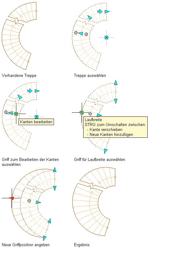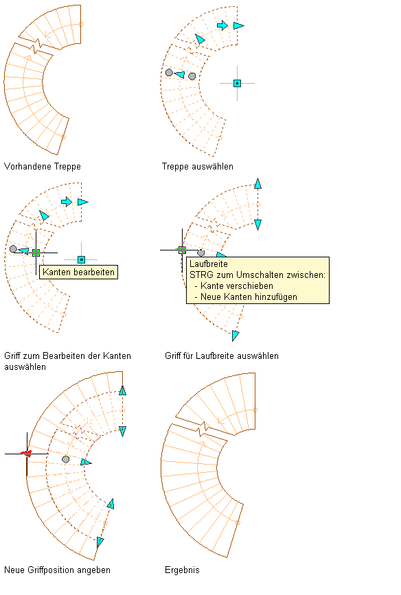 Gehen Sie wie folgt vor, um die Außenkante einer Wendeltreppe zu ändern. Hierzu stehen zwei Vorgehensweisen zur Verfügung: