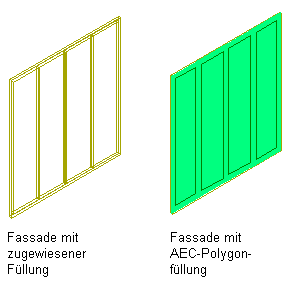 Eine Fassade kann Fassadenelemente umfassen. Fassadenelemente sind Fassaden sehr ähnlich. Allerdings können deren Rasterzellen nur Füllungen und keine Objekte enthalten. Fassadenelemente stellen komplexe Elemente dar, die sich in der Hauptfassade wiederholen. Sie können AEC-Polygone verwenden, um die Raster in einem Fassadenelement zu füllen.