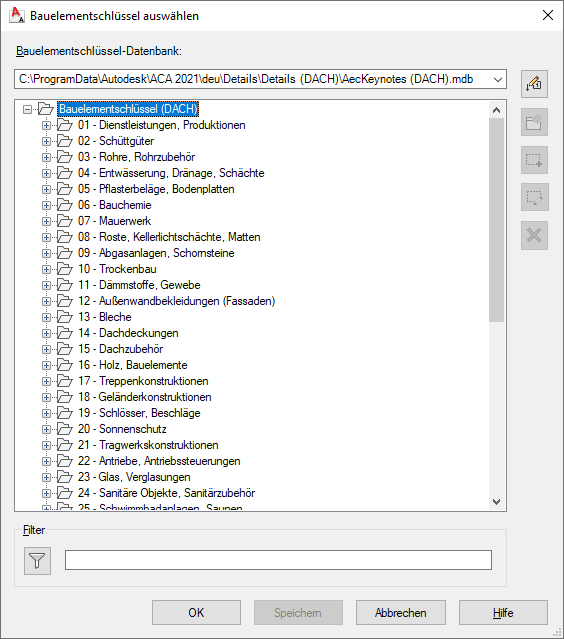 Das Dialogfeld Bauelementschlüssel wählen enthält eine hierarchische Baumstruktur der ausgewählten Bauelementschlüssel-Datenbank. Sie können in diesem Dialogfeld einen Bauelementschlüssel auswählen, der in eine Zeichnung eingefügt oder einem Objektstil, einer Materialdefinition oder einer Detailkomponente zugewiesen wird. Dieses Dialogfeld wird angezeigt, wenn Sie einem Objekt einen Bauelementschlüssel zuweisen möchten, für den noch kein Bauelementschlüssel definiert wurde. Außerdem können Sie es im Dialogfeld Schriftfeld und in den Dialogfeldern auswählen, in denen Sie Bauelementschlüssel für Architekturobjekte bzw. deren Komponenten angeben können. Beim Erstellen einer Bauelementlegende können Sie auf das Dialogfeld Bauelementschlüssel wählen zugreifen, indem Sie während des Einfügens mit der rechten Maustaste klicken und den Eintrag Von Datenbank auswählen, oder indem Sie in der Befehlszeile d (Datenbank) eingeben.