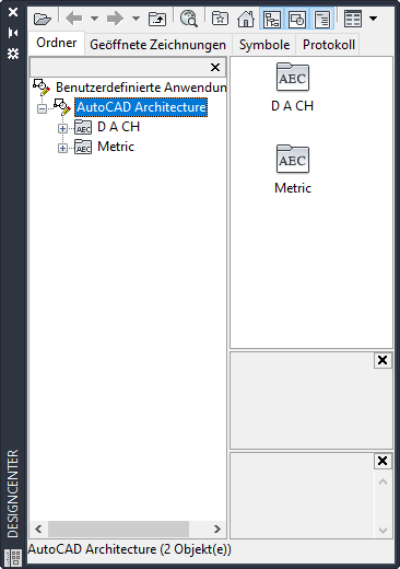 Zusätzlich zu den Symbolen stehen auch andere Typen von vordefinierten Inhalten zur Verfügung, etwa Layer, Vorlagen und Materialien. Diesen Inhalt finden Sie unter C:\ProgramData\Autodesk\ACA <Version>\deu.