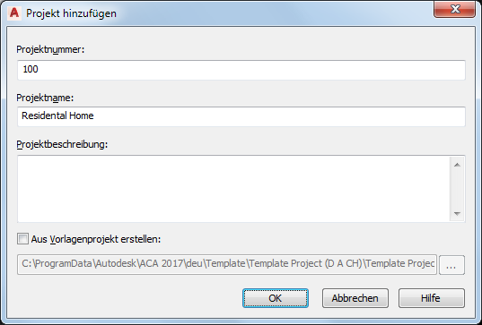 Anmerkung: Sie können beim Erstellen eines neuen Projekts nicht alle Support-Dateien und Pfade direkt festlegen, sondern nur Name, Nummer, Beschreibung und Projektvorlage. Die übrigen Eigenschaften werden nach der Erstellung des Projekts festgelegt. Wenn Sie das Projekt mithilfe einer Vorlage erstellen, werden zunächst deren Eigenschaften übernommen. Wenn Sie ein Projekt ohne Verwendung einer Vorlage erstellen, sind die Eigenschaften zunächst leer oder werden durch die AEC-Standardprojektoptionen definiert.