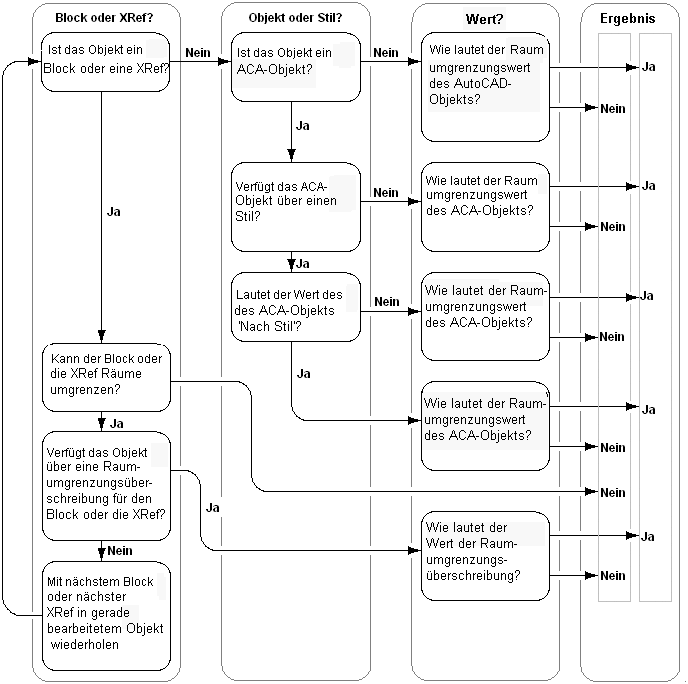 Die folgende Übersichtsgrafik zeigt, wie die Einstellung der Raumumgrenzungseigenschaft für ein Umgrenzungsobjekt die Erzeugung assoziativer Räume beeinflussen kann. Weitere Informationen zum Einstellen der Raumumgrenzungseigenschaft für ein Umgrenzungsobjekt finden Sie in den folgenden Abschnitten.