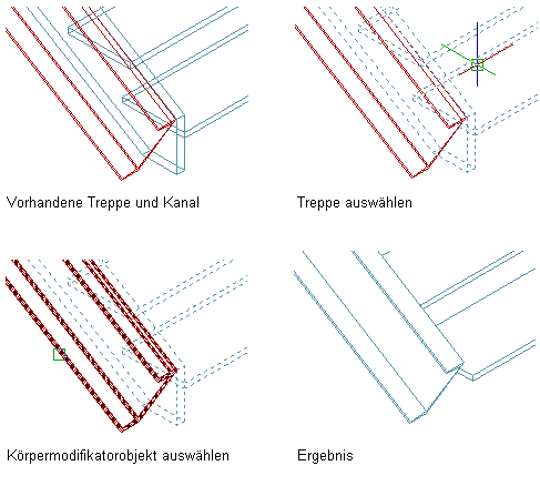 Folgende Abbildung zeigt, wie ein Kanal als Körpermodifikator verwendet wird, um eine Treppenwangenkomponente zu ersetzen.
