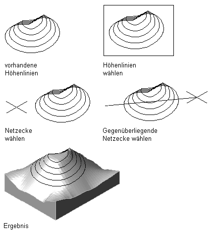 | Erstellen einer Oberfläche basierend auf den eingegebenen Höhenlinienkurven und -punkten (Delaunay-Triangulation) | Geben Sie für Regelmäßiges Netz erstellen [Ja/Nein] n (Nein) ein. |