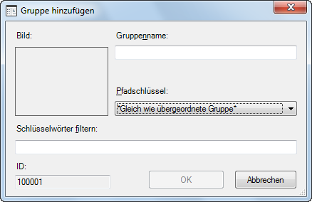 Das Dialogfeld Komponentengruppe hinzufügen wird geöffnet. Im schreibgeschützten Feld ID wird der dieser Gruppe in der Datenbanktabelle Groups zugewiesene Wert angezeigt.