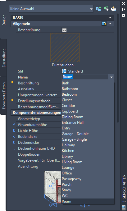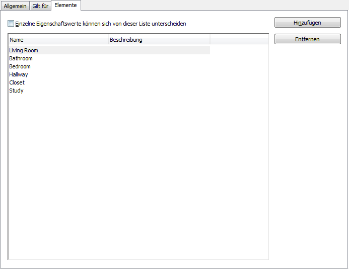 Listendefinitionen sind benannte Listen für Räume und Zonen. Sie können eine Listendefinition zu einem Raumstil oder Zonenstil hinzufügen, um sicherzustellen, dass alle Räume oder Zonen, die mit dem Stil eingefügt werden, Namen aus der Liste verwenden. Listendefinitionen können für verschiedene Zwecke erstellt werden, beispielsweise für die konsistente Benennung von Räumen entsprechend einem Gebäudestandard.