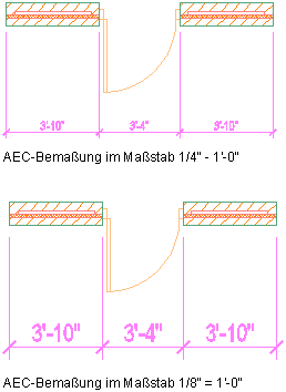 Die folgende Abbildung zeigt eine AEC-Bemaßung in zwei verschiedenen Beschriftungsmaßstäben. Die AEC-Bemaßung wurde in der Zeichnung im ersten Beschriftungsmaßstab erstellt. Dann wurde der Beschriftungsmaßstab geändert.