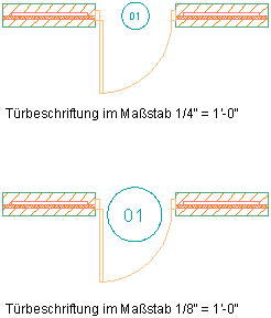 Die folgende Abbildung zeigt eine Türbeschriftung in zwei verschiedenen Beschriftungsmaßstäben. Die Türbeschriftung wurde in der Zeichnung im ersten Beschriftungsmaßstab erstellt. Dann wurde der Beschriftungsmaßstab geändert.