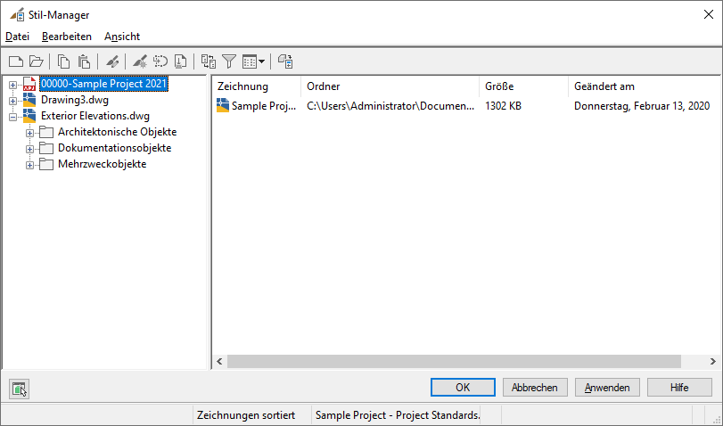 Gehen Sie wie folgt vor, um die Sortierweise von Stilen im Stil-Manager zu ändern. Vorgabemäßig werden die Namen von offenen Zeichnungen und Vorlagen in der Strukturansicht im linken Fensterbereich angezeigt. Wenn Sie in der Baumstruktur eine Zeichnung erweitern, werden die einzelnen Stile in der Zeichnung in drei Kategorien angezeigt: Architekturobjekte, Dokumentationsobjekte und Mehrzweckobjekte. Wenn Sie diese Kategorien erweitern, werden die einzelnen Stile in alphabetischer Reihenfolge der Stiltypen aufgeführt.