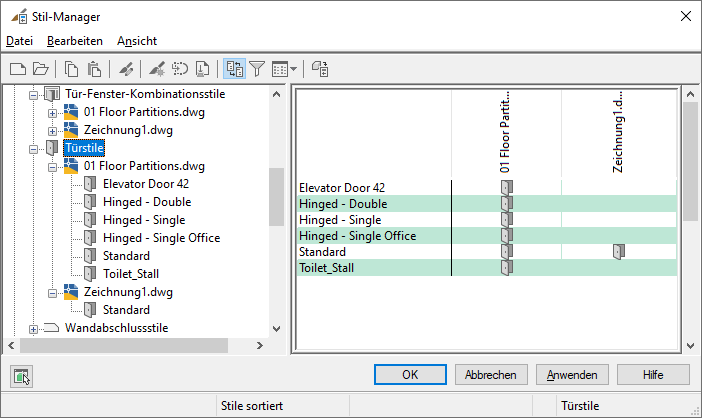 Standardstile werden in Standardszeichnungen verwaltet, die dem Projekt zugewiesen werden. Wenn eine Gruppe von Stilen als Projektstandardstile definiert und in den Projektzeichnungen angewendet wurde, sind sie mit den Standards verknüpft, sodass sie synchronisiert werden können. Über dieselbe Verknüpfung können Stile aus einer Projektzeichnung auch die Standards aktualisieren.
