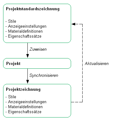 Während der Arbeit an diesem Projekt kann dieses jederzeit mit den Projektstandards verglichen werden. Wird dabei festgestellt, dass die Versionen in den Projektzeichnungen nicht mit denen in den Projektstandards übereinstimmen, kann das Projekt mit den Projektstandards synchronisiert werden. Wenn nötig, können auch die Standards an die Projektzeichnungen angeglichen werden.