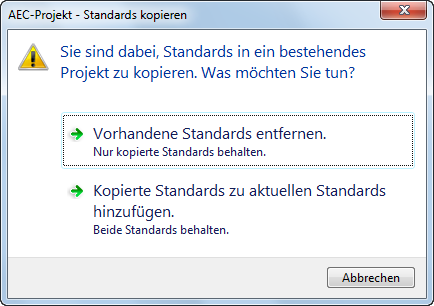 | Überschreiben der bestehenden Projektstandards mit den kopierten Projektstandards |