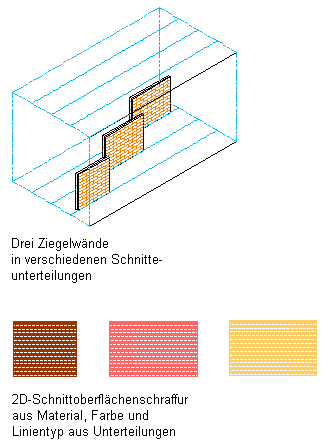 Wenn Sie in einem Stil neue Unterteilungen definieren, dann sollen sich die darin enthaltenen Objekte in aller Regel von anderen Unterteilungen unterscheiden. Beim Zuweisen von Materialien zu Objekten können Sie einen 2D-Schnittstil so einstellen, dass die Oberflächenschraffur des Materials verwendet, die Farben und Linientypen dagegen den Darstellungseigenschaften der Unterteilung entnommen werden.