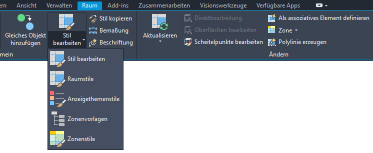 Je nach ausgewähltem Objekt haben Sie nicht nur Zugriff auf die Stile dieses Objekts, sondern auch auf Stile von unterstützenden Objekten. Haben Sie beispielsweise einen Raum ausgewählt, können Sie auf Raumstile, Zonenstile, Zonenvorlagen und Anzeigethemenstile zugreifen.