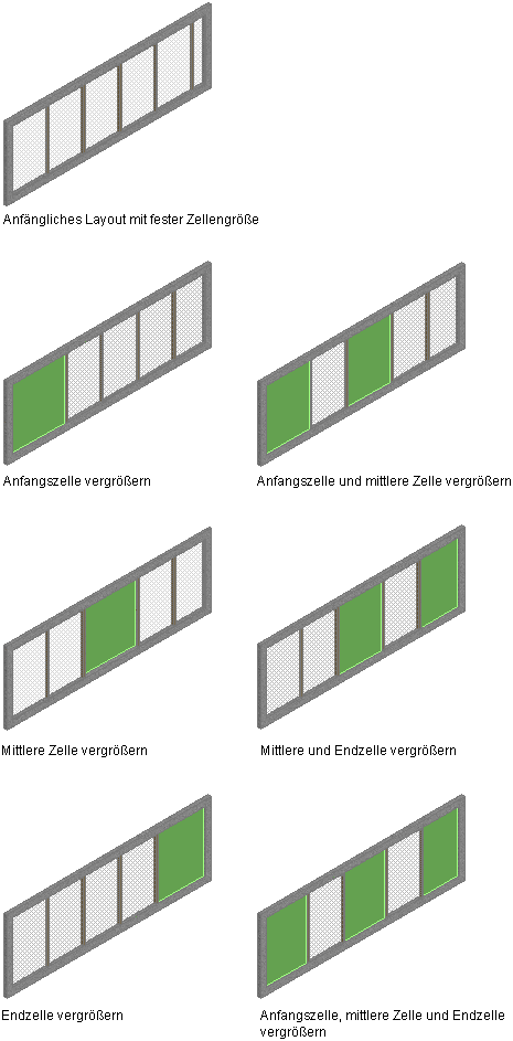 Sie können die Rasterunterteilungen automatisch anpassen, indem Sie eine Zelle am Anfang, in der Mitte oder am Ende bzw. eine beliebige Kombination dieser Zellen angeben, die vergrößert werden sollen. Die Größe der einzelnen Zellen hängt von den angegebenen Zellen ab. In der folgenden Abbildung werden alle möglichen Kombinationen für das Vergrößern von Zellen am Beispiel einer Tür-Fenster-Kombination veranschaulicht. Die jeweiligen Zellen sind grün hervorgehoben.