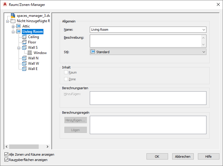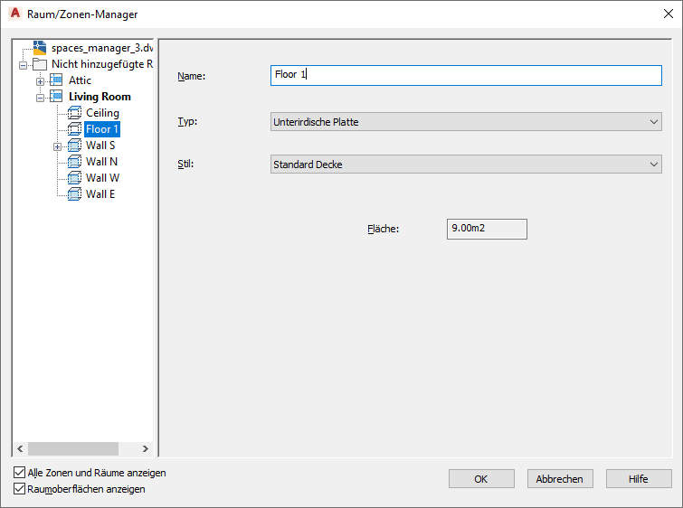 . Um alle Räume in der Zeichnung sowie alle ihre Oberflächen und Oberflächenöffnungen anzuzeigen, müssen die Optionen Alle Zonen und Räume anzeigen und Raumflächen anzeigen ausgewählt sein.