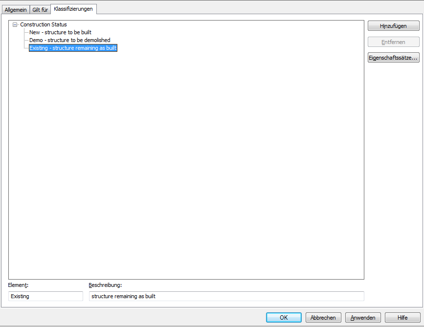 Erstellen einer Klassifizierungsdefinition für den Konstruktionsstatus