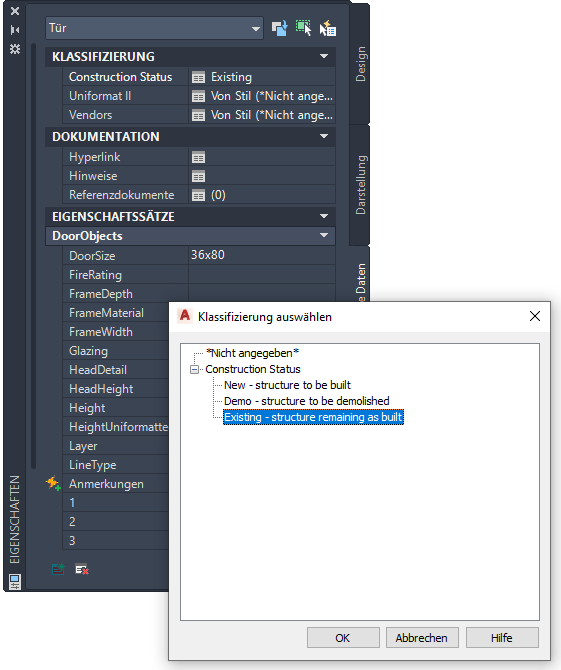 Die Klassifizierungsdefinition wird auf der Registerkarte Klassifizierungen unter den Objektstileigenschaften aufgeführt. Sie wählen eine Klassifizierung, z. B. Neu, im Objektstil. Ihre Zeichnung kann beispielsweise bestimmte Türstile für vorhandene Türen und andere Stile für neue Konstruktionen enthalten. Alle über diese Stile erstellten Türen haben im jeweiligen Stil festgelegte Klassifizierungen.