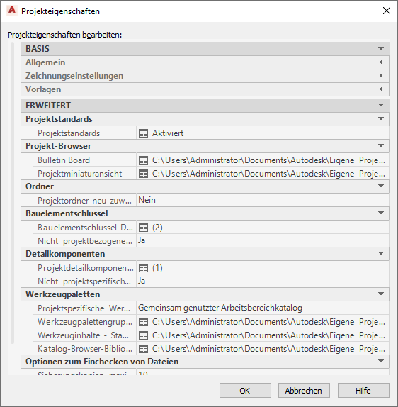Sie können erweiterte Projekteigenschaften wie Standards, Bilder, Bauelementschlüssel, Detailkomponenten und Werkzeugpaletten definieren oder ändern.