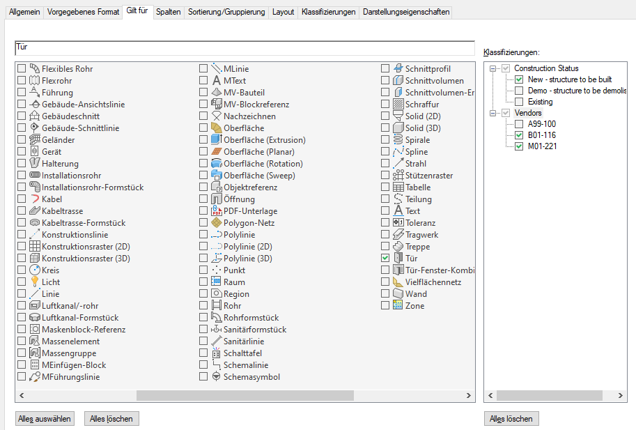 Alle Klassifizierungsdefinitionen, die auf dasselbe Objekt angewendet werden, für die die Eigenschaftssatz-Definition gilt, werden auf der rechten Seite mit einer Liste ihrer zugehörigen Klassifizierungen dargestellt. Wenn Klassifizierungen gewählt werden, kann die Eigenschaftssatz-Definition nur auf solche Objekte oder Stile sowie auf der linken Seite gewählte Definitionen angewendet werden, die über alle ausgewählten Klassifizierungen der rechten Seite verfügen.