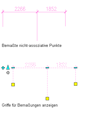 | Bemaßung von nicht-assoziativen Punkten in der Zeichnung (erstellt eine nicht-assoziative Bemaßung) | Vergewissern Sie sich, dass OFANG deaktiviert ist. Geben Sie in der Befehlszeile p (Punkte auswählen) ein, und geben Sie Punkte in der Zeichnung an. |