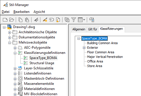 In eine Zeichnung eingefügte BOMA Klassifizierung