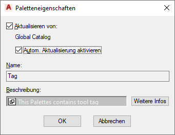 Der Name der Werkzeugpalette im Katalog-Browser (über den die gewählte Werkzeugpalette aktualisiert wird) wird unter Name angezeigt.