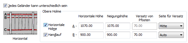 Festlegen der Höhe der horizontalen Holme bzw. des Handlaufs Geben Sie unter Horizontale Höhe einen Wert ein.