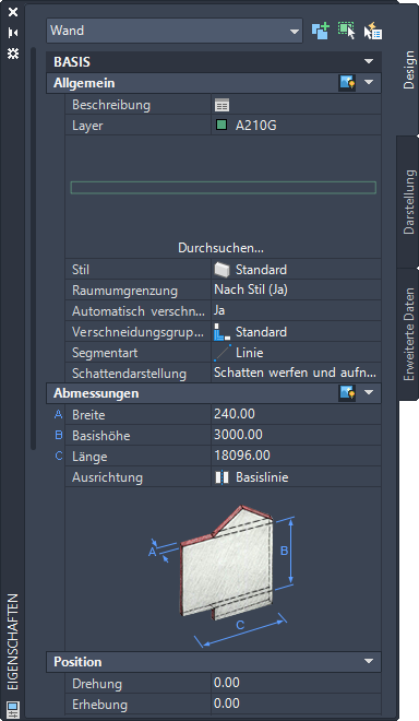 Eigenschaftenpalette für ein Standard-Wandobjekt