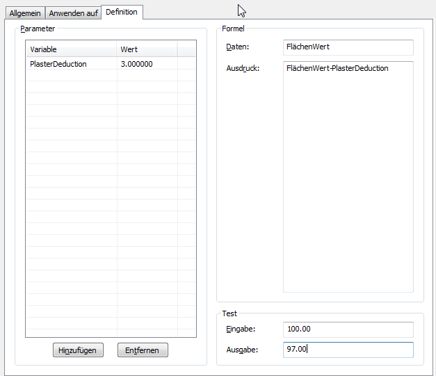 Ein Berechnungsmodifikator ist ein Wert oder eine Formel, den Sie zu den Flächen- und Umfangwerten jeder Ungrenzung eines Raums hinzufügen können, um die Werte für bestimmte Berechnungen zu ändern. Sie können beispielsweise für alle Innenwände einen Abzug für Putz von 3 % festlegen, oder einen Balkon mit nur 50 % der Quadratmeter für die Vermietung berechnen.