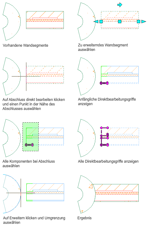 Gehen Sie wie folgt vor, um einen Wandabschluss durch Dehnen einer Komponente zu ändern. Eine Dehnumgrenzung kann eine Linie, ein Bogen, ein Kreis, eine Polylinie oder eine Wandkomponentenkante sein.