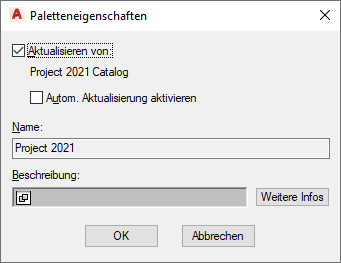 Wenn Sie Autom. Aktualisierung aktivieren wählen, werden sämtliche verknüpfte Werkzeugpaletten bei jedem Start der Software aktualisiert, um alle eventuellen Änderungen an der Werkzeugpalette und deren Inhalt im Werkzeugkatalog zu erfassen.