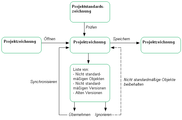 Wenn ein Projekt mit seinen Standards synchronisiert wird, werden die darin enthaltenen Stile und Anzeigeeinstellungen mit den Projektstandards verglichen, um eventuelle Versionsunterschiede zu finden und zu beheben.
