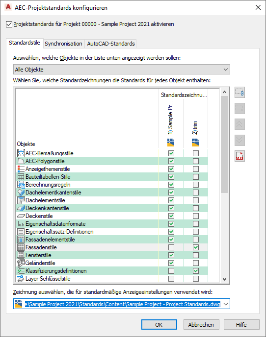 Die Synchronisation der AutoCAD-Standards (DWS) eines Projekts ist ein eigener, von der Synchronisation der AEC-Standards des Projekts unterschiedener Vorgang. Während für die AEC-Standards eines Projekts die automatische Synchronisation beim Öffnen von Zeichnungen vorgegeben werden kann, muss die Synchronisation der AutoCAD-Standards manuell vom Benutzer gestartet werden. Beim Einrichten der AutoCAD-Standards in einem Projekt wird automatisch eine CHX-Datei erstellt. Diese Datei enthält die Projektzeichnungen und die dazugehörigen AutoCAD-Projektstandardszeichnungen. Die CHX-Datei des Projekts kann dann mithilfe der stapelweisen Standardsprüfung geöffnet werden. Anschließend kann das gesamte Projekt im Stapelverfahren geprüft werden.
