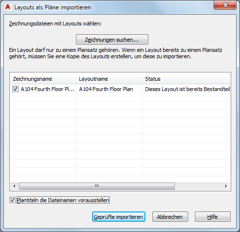 Jeder Plan kann immer nur zu einem Plansatz gehören. Sie können einen Plan nicht importieren, wenn dieser bereits Teil eines anderen Plansatzes ist.